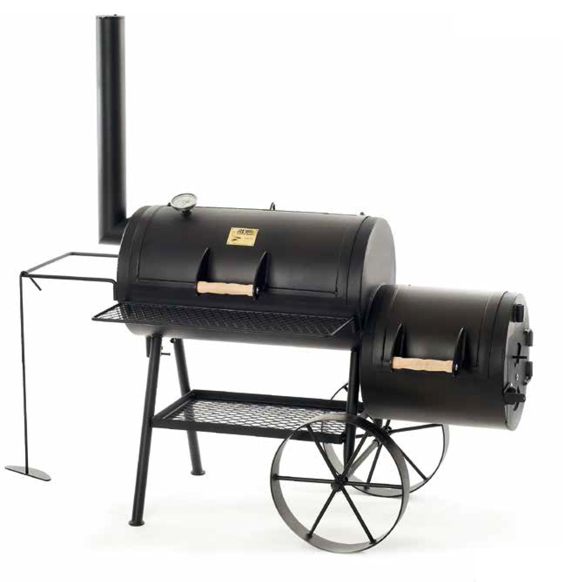 Le modèle d'entrée de gamme des JOE's Barbeque Smokers. Fabriqué en tôle d'acier de 5,2 mm d'épaisseur, équipé d'un plateau avant et d'un plateau inférieur, de deux grilles de cuisson en acier inoxydable dans la chambre de cuisson, d'un thermomètre en acier inoxydable, d'un système d'égouttement et d'un tisonnier. Sans support de grille dans le foyer.