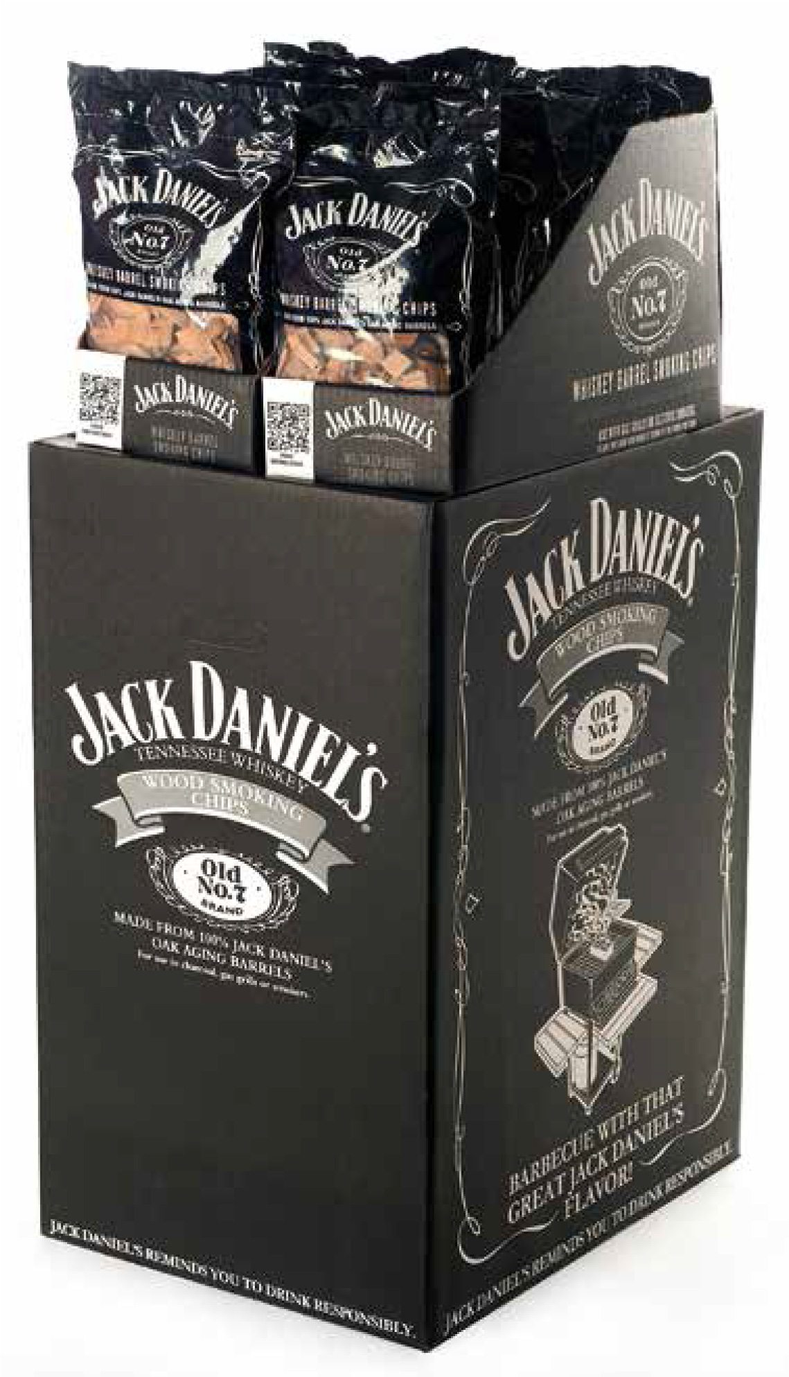 Présentoir commercial Jack Daniel's avec 48 paquets de copeaux de bois de fumage Jack Daniel's.