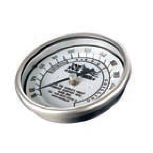 Thermomètre bimétallique, étalonné de 10 à 260°C, avec des graduations spécifiques au fumage, au barbecue et à la grillade.