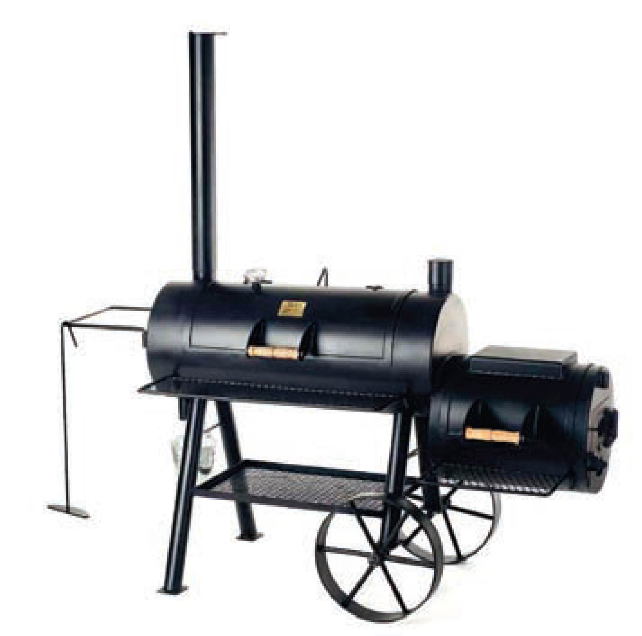Der Reverse Flow ist im Prinzip auch ein 16“ Longhorn. Zum Reverse Flow macht ihn die Art des Rückflusses im Pit. Der Abzug befindet sich nicht wie sonst auf der zur Feuerbox gegenüberliegenden Seite, sondern rechts vom Pit. Der Smoker lässt sich dadurch auf zwei Arten nutzen, einmal als „normaler“ Smoker mit Abzug links oder eben mit Abzug auf der rechten Seite als Reverse Flow Smoker.
