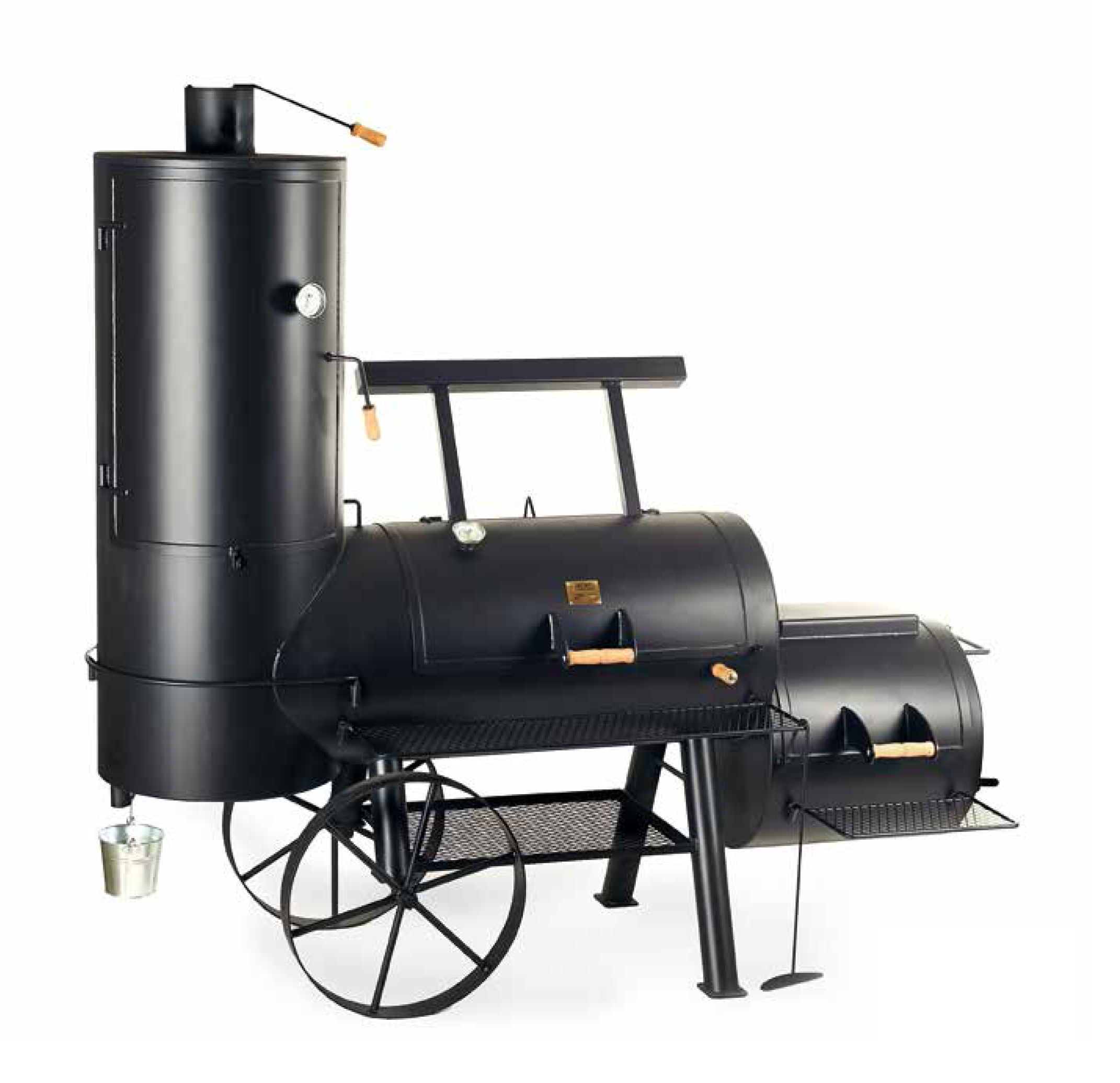 Solide Stahlverarbeitung aus 6,35 mm starkem Stahlrohr, einmaliges Hitzeverteilungssystem mit Grillin Box und Konvektionsrohr. Sandgestrahlt und mit einer 850 °C hitzebeständigen Farbe beschichtet. Gegengewicht am Garkammerdeckel für leichtes Öffnen des Deckels. Ideale Temperaturkontrolle durch Dual Damping System, Edelstahlthermometer an Gar- und Räucherkammer.